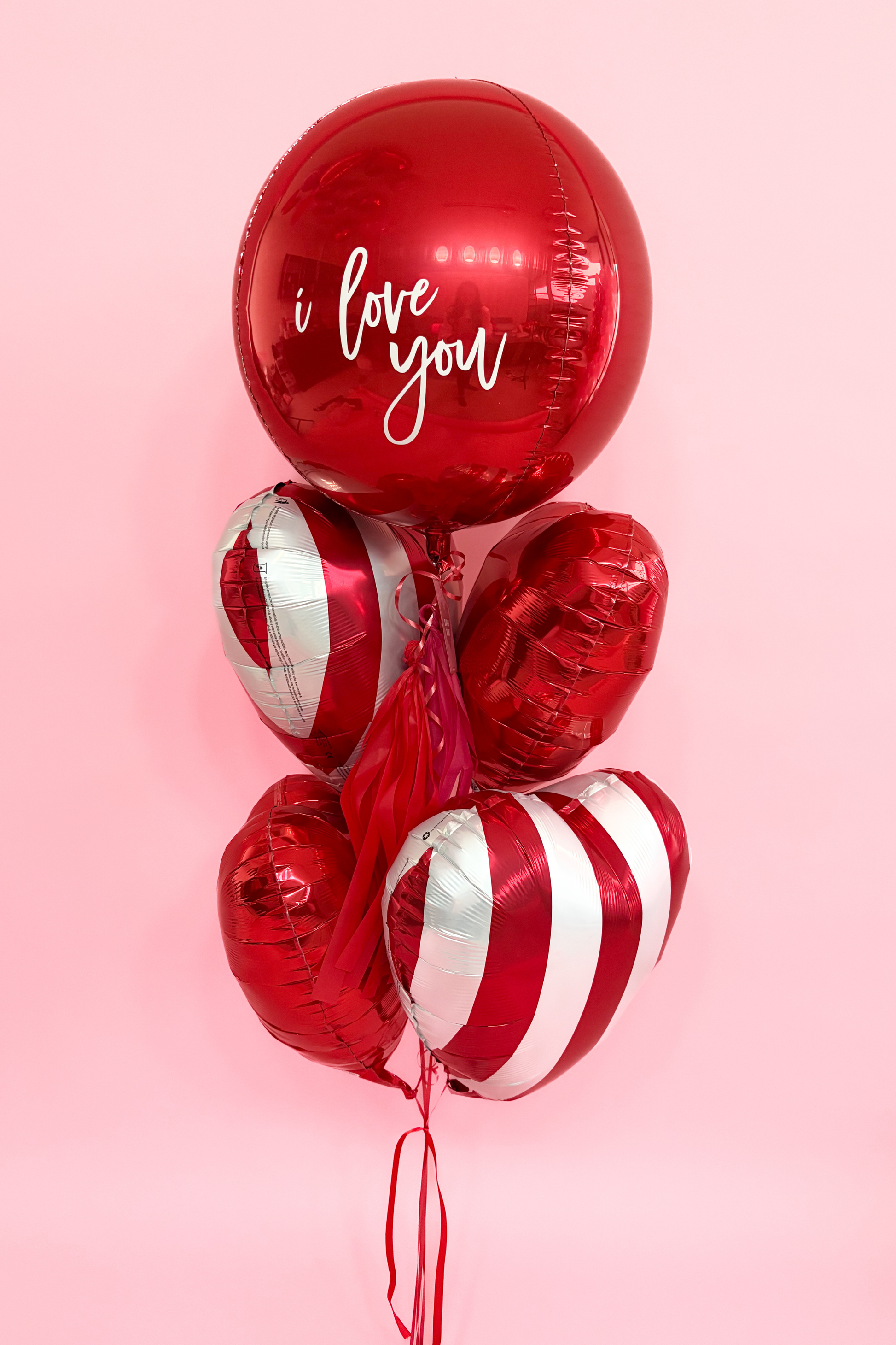 - Esfera Chica + Tag Valentine's Edition + 2 globos metálicos de corazón rojo + 2 globos metálicos de corazón a rayas + Guirnalda y contrapeso