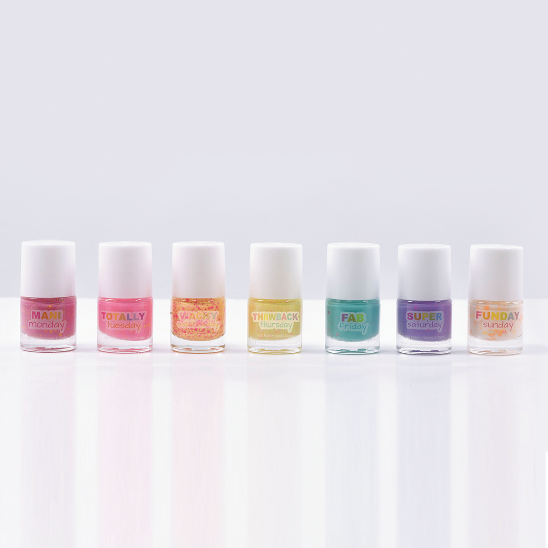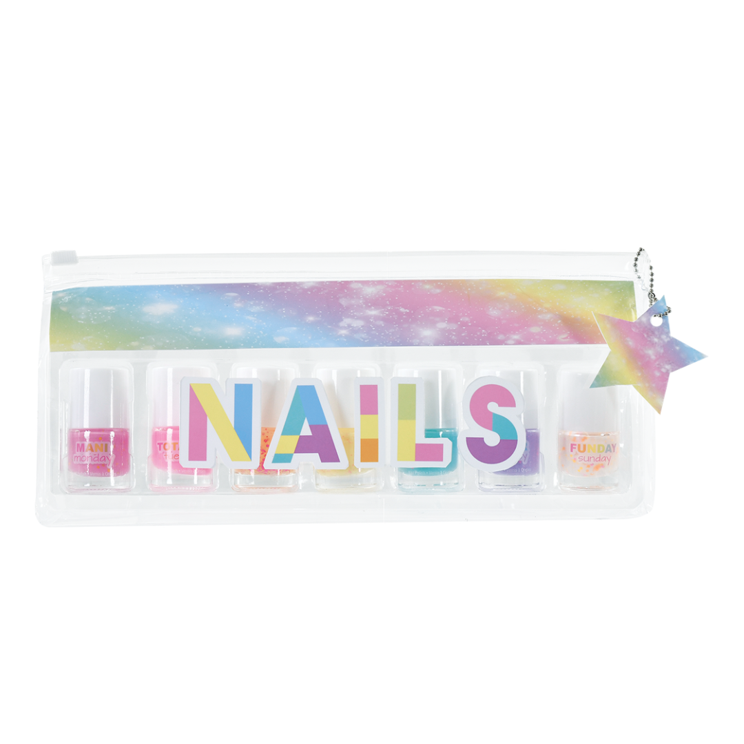 Juego de 7 piezas, 1 para cada día de la semana. Empacado en una divertida bolsa transparente con cremallera con un charm de lima de uñas en forma de estrella.