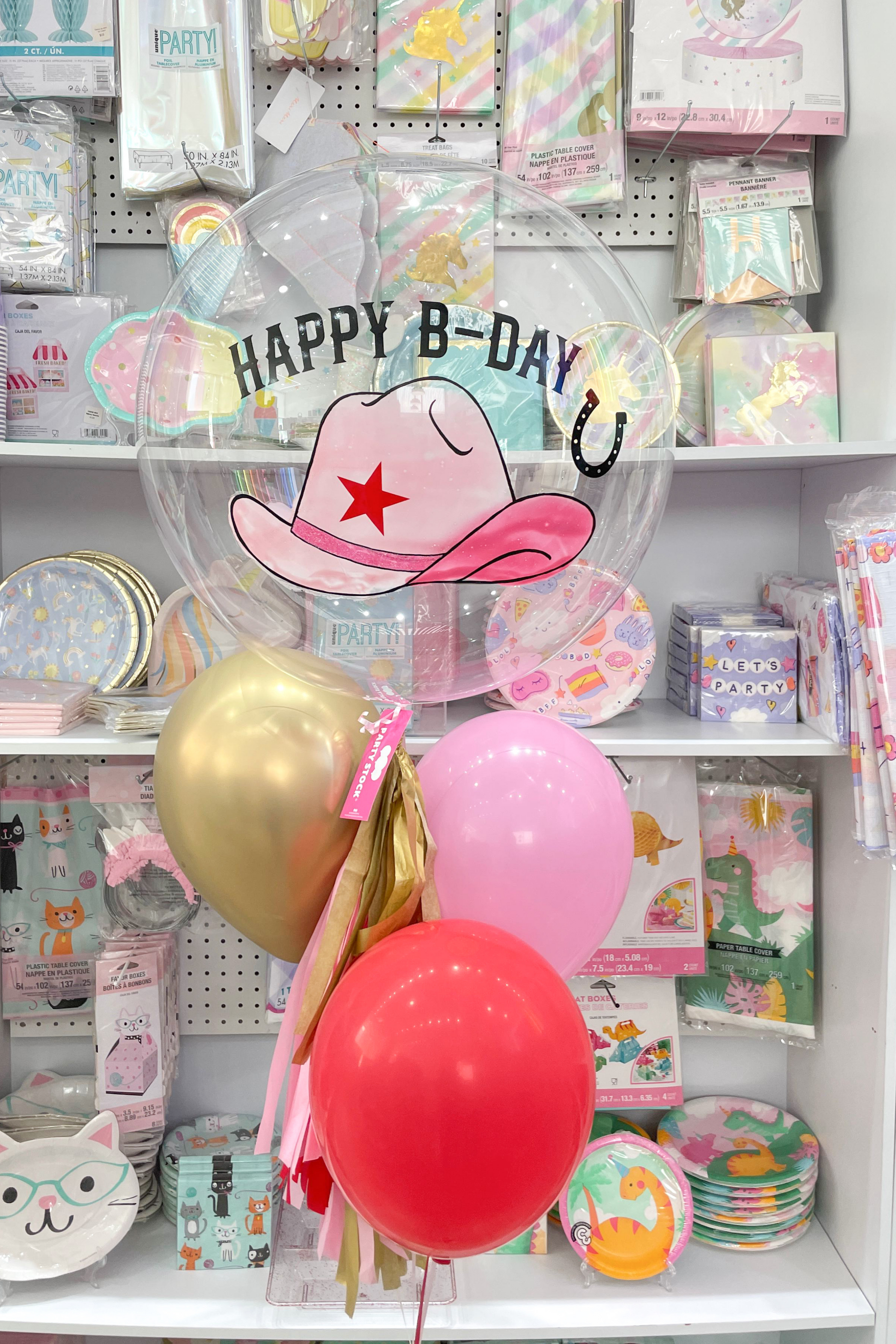 Este bouquet incluye un globo burbuja grande de temática vaquera con frase en vinil, tres globos de látex 12" en combinación, una guirnalda decorativa, tag y contrapeso. Ideal para un cumpleaños con temática western!!