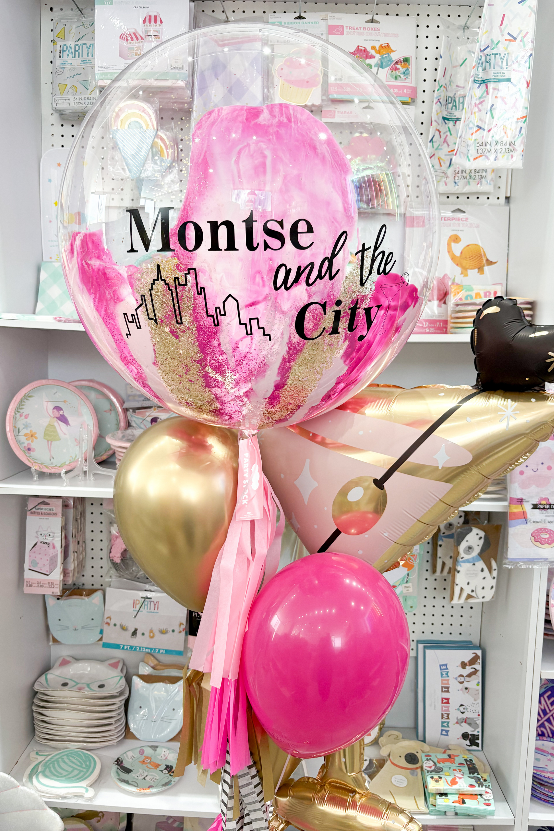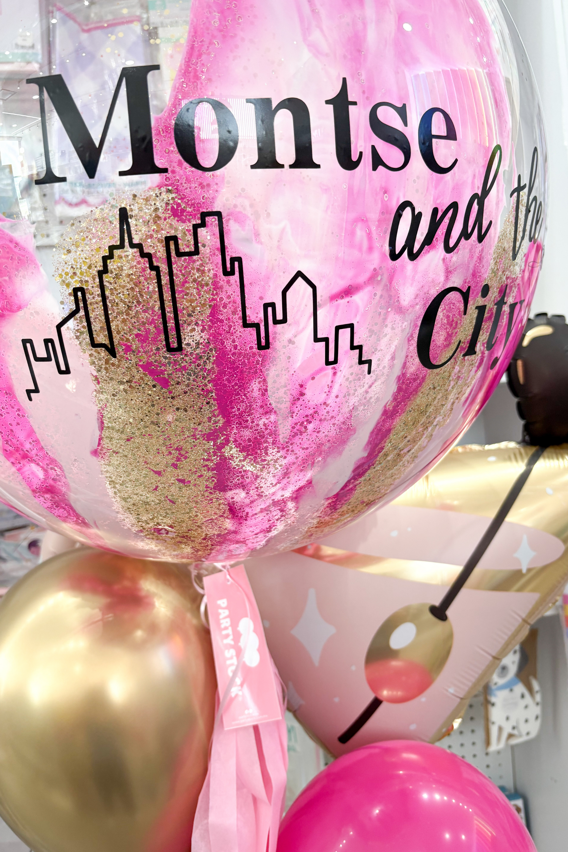 – Globo burbuja grande con pintura en tonos rosas y glitter dorado personalizado con vinil.
