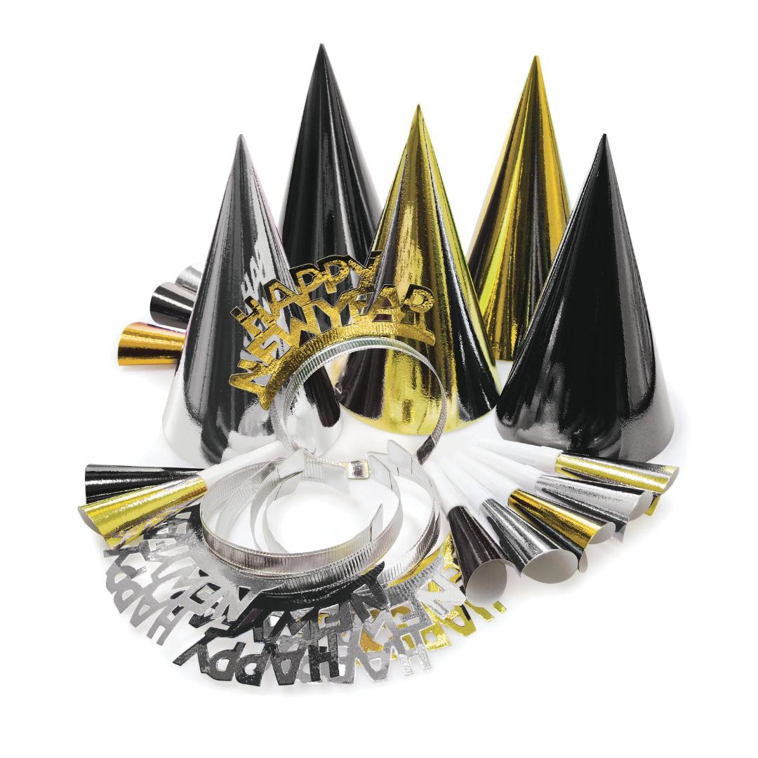 Kit 10 personas. Contiene 5 gorritos, 5 diádemas y 10 cornetas.