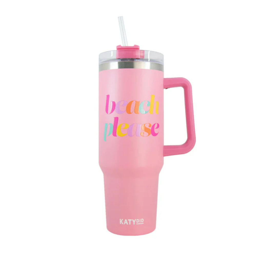 The serene pink color, paired with the playful "beach please" inscription in vibrant hues, embodies the carefree spirit of summer. The convenient handle and straw add functionality, making it a sought-after accessory for sunny days.