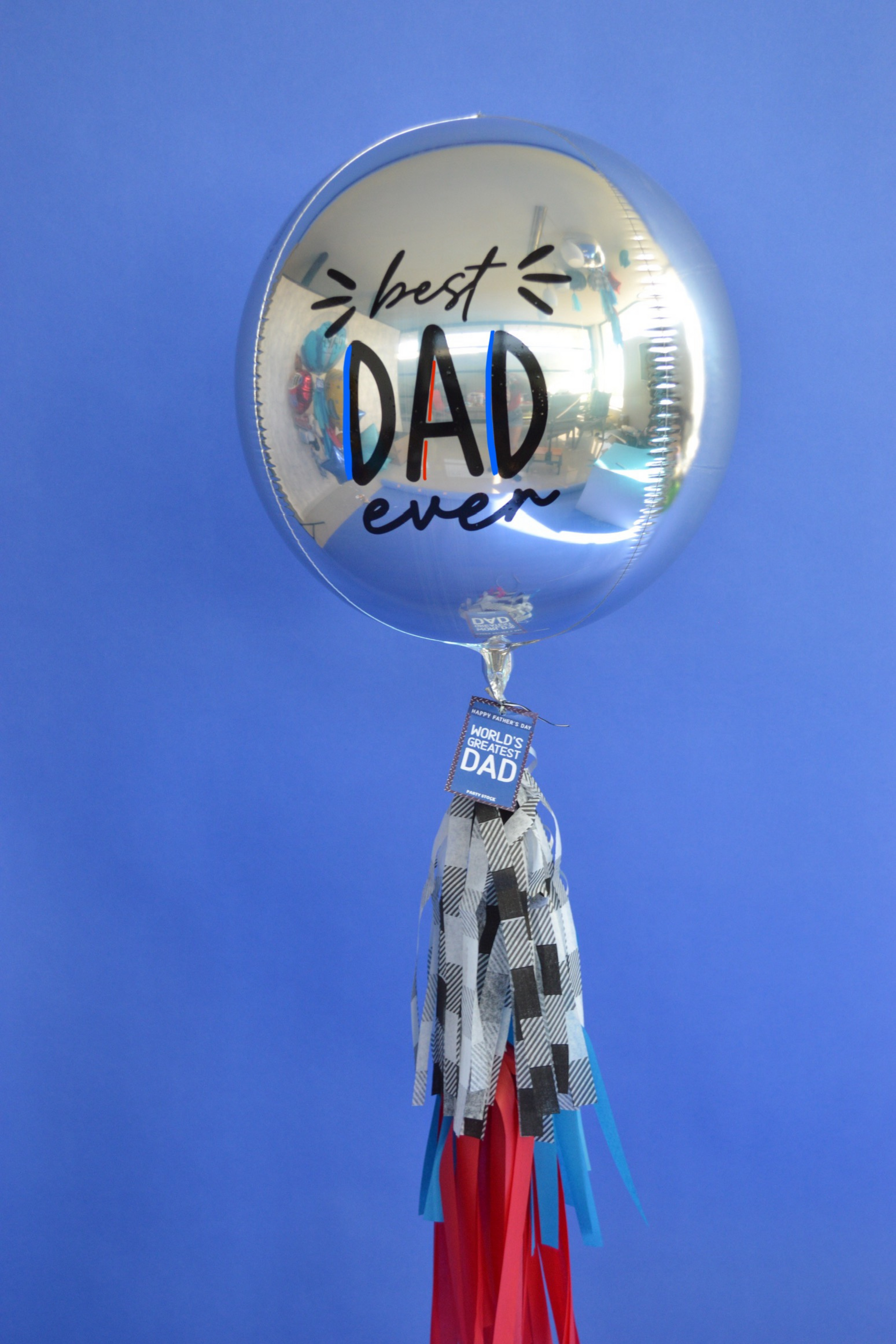 • Esfera chica 16" personalizada con vinil a elegir, guirnalda y tag decorativo.