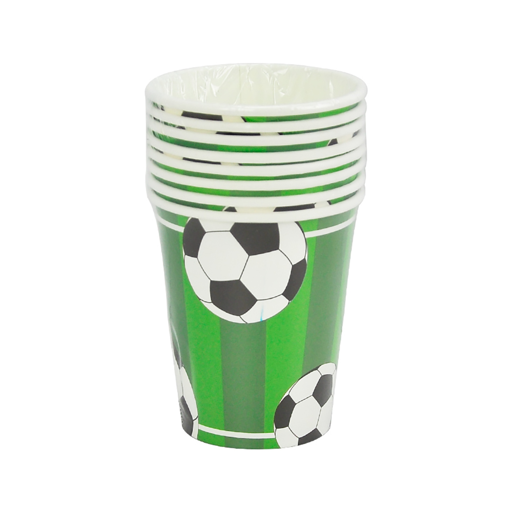 Ideal para fiestas de cumpleaños, eventos deportivos o reuniones casuales. Cada set incluye 8 vasos de papel con un diseño de fútbol de 9 onzas.